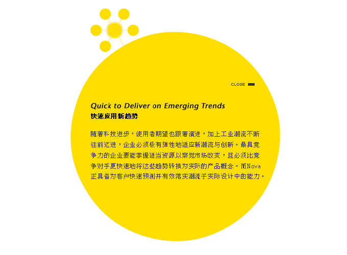 在设计投资普及的时代中,想要取得优势地位的企业不只须专注于“产品创新: Product Innovation”,还必须聚焦于“设计系统: Design System”,藉此让设计努力的产出较其他对手更具竞争力。Nova以前瞻思考的设计思维,即时针对客户需求,灵活运作设计系统。